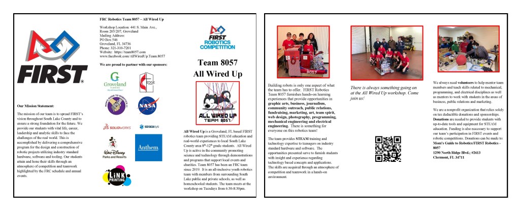 All Wired Up FIRST ® Robotics Competition (FRC) team is an all-inclusive Youth Robotics team for middle school and high school students with members from surrounding South Lake County schools (public and private) as well as home-schooled students. We do accept students from anywhere in Lake (or surrounding) County. We promote science and technology while developing vital life, career and leadership skills. We won’t only build robots, but also relationships, friendships and futures.